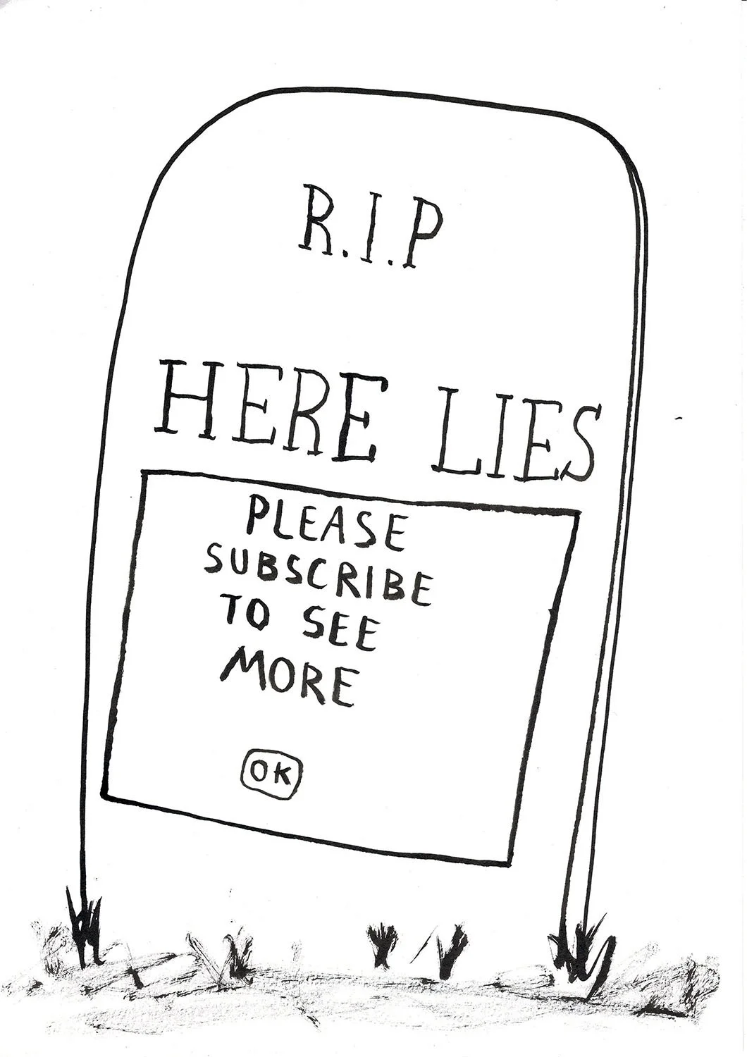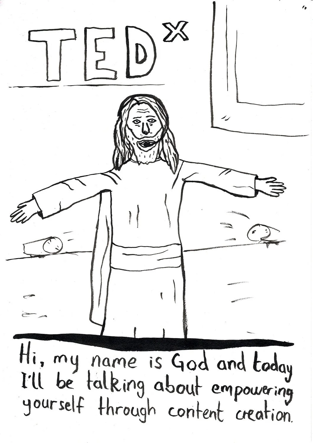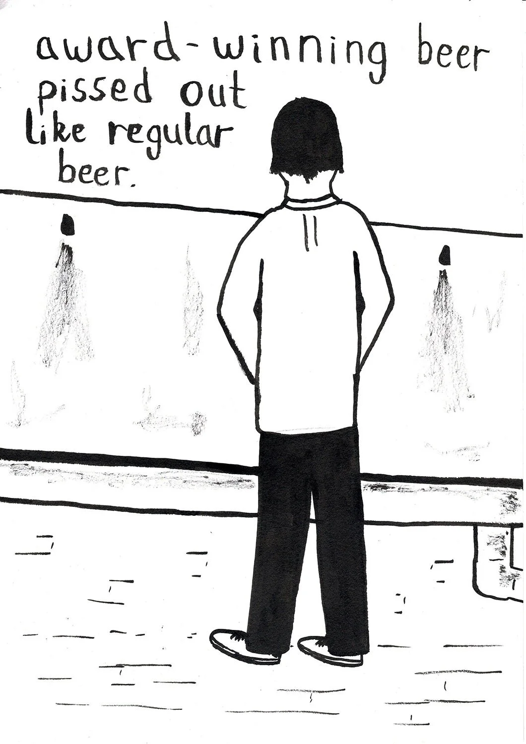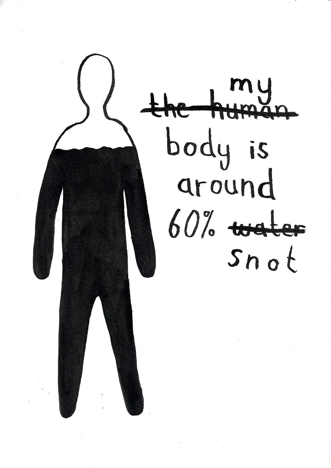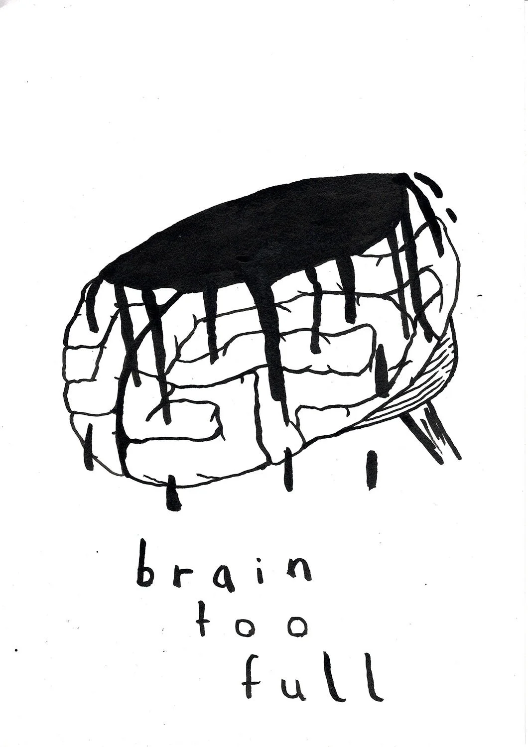 Initially the style of these drawings began as a single idea for a zine of quick, humorous sketches which formed a zine titled Brain Puke, self-published in 2012. Since then the drawings have continued, as have the zines. I have come to know them all as simply Brain Puke’s. The drawings, which are still often compiled into zines, are finished works in their own right, however they are also sketches for larger works, they often are the beginning stages of paintings or perhaps they are simply re-produced in a different format.